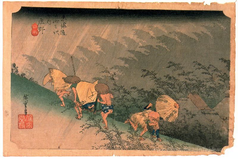 Nous vous proposons une reproduction artisanale sur toile du célèbre tableau 'Pluie blanche, shono' de Hiroshige, provenant du Musée de la Reproduction.
