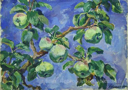 Nous vous proposons une reproduction artisanale sur toile du célèbre tableau 'Pommes contre le ciel bleu' de Pyotr Konchalovsky, provenant du Musée de la Reproduction.