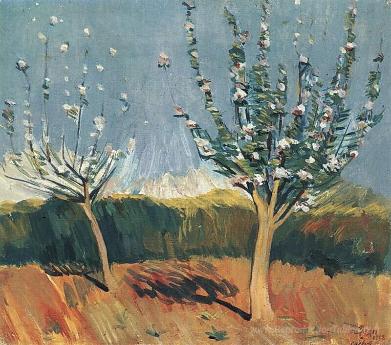 Nous vous proposons une reproduction artisanale sur toile du célèbre tableau 'Pommiers en fleur' de Martiros Saryan, provenant du Musée de la Reproduction.