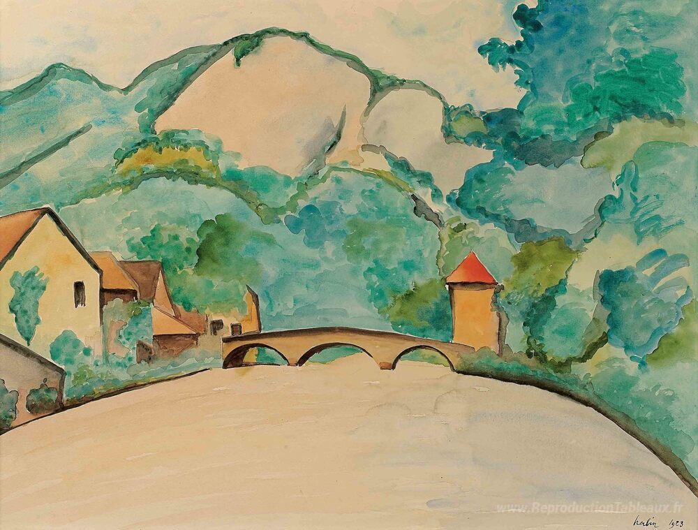 Nous vous proposons une reproduction artisanale sur toile du célèbre tableau 'Pont sur la Loue à Moutier' de Auguste Herbin, provenant du Musée de la Reproduction.