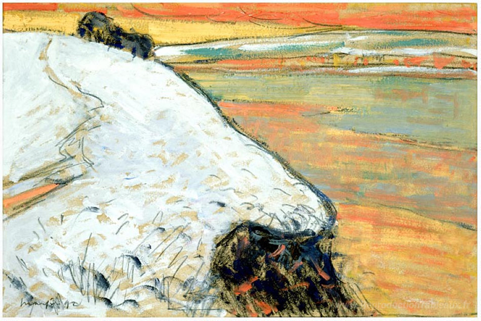 Nous vous proposons une reproduction artisanale sur toile du célèbre tableau 'Pont-aven, ciel rouge' de Maxime Maufra, provenant du Musée de la Reproduction.