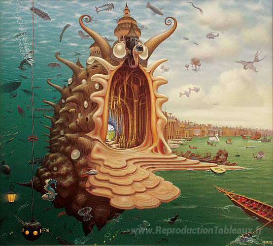 Nous vous proposons une reproduction artisanale sur toile du célèbre tableau 'Porto' de Jacek Yerka, provenant du Musée de la Reproduction.