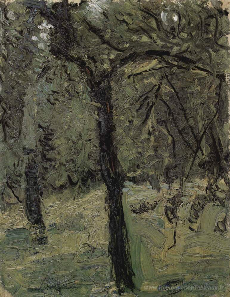 Nous vous proposons une reproduction artisanale sur toile du célèbre tableau 'Prairie ensoleillée avec des arbres fruitiers' de Richard Gerstl, provenant du Musée de la Reproduction.