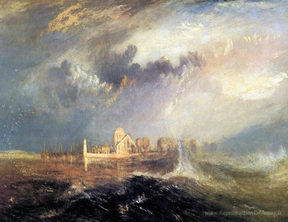 Nous vous proposons une reproduction artisanale sur toile du célèbre tableau 'Quillebeuf, à l'embouchure de Seine' de William Turner, provenant du Musée de la Reproduction.