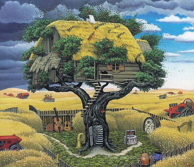 Nous vous proposons une reproduction artisanale sur toile du célèbre tableau 'Récolte' de Jacek Yerka, provenant du Musée de la Reproduction.