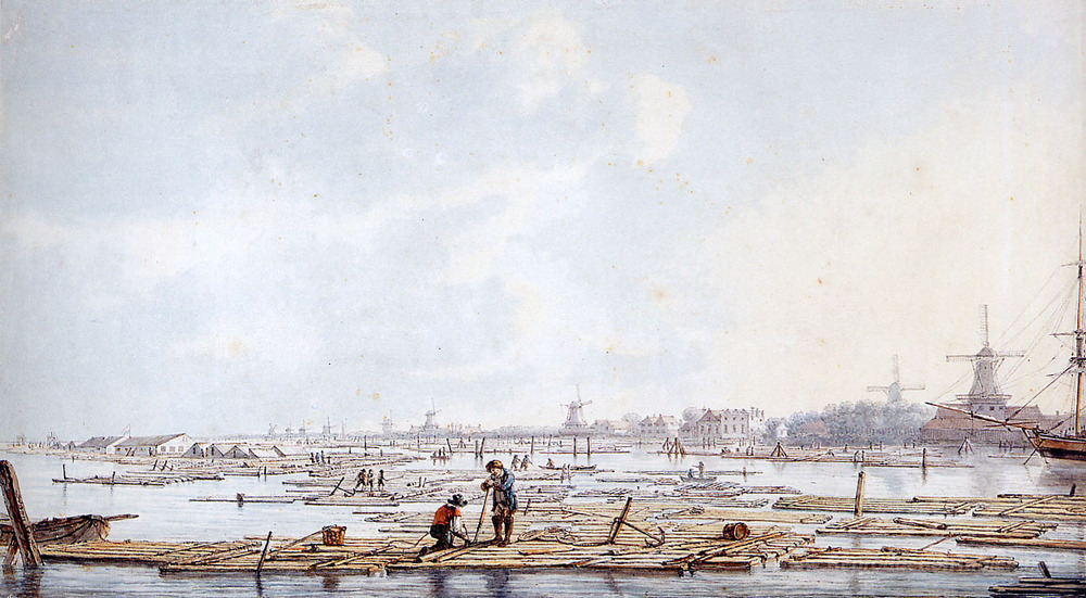 Nous vous proposons une reproduction artisanale sur toile du célèbre tableau 'Radeaux en bois pm le biesbosch' de Abraham van Strij, provenant du Musée de la Reproduction.