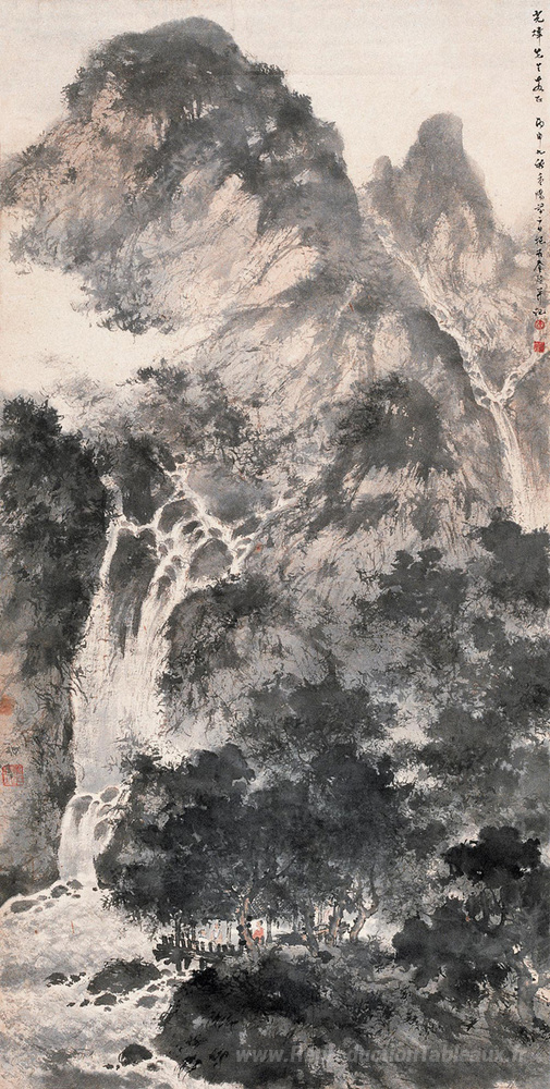 Nous vous proposons une reproduction artisanale sur toile du célèbre tableau 'Rassembler dans les montagnes' de Fu Baoshi, provenant du Musée de la Reproduction.