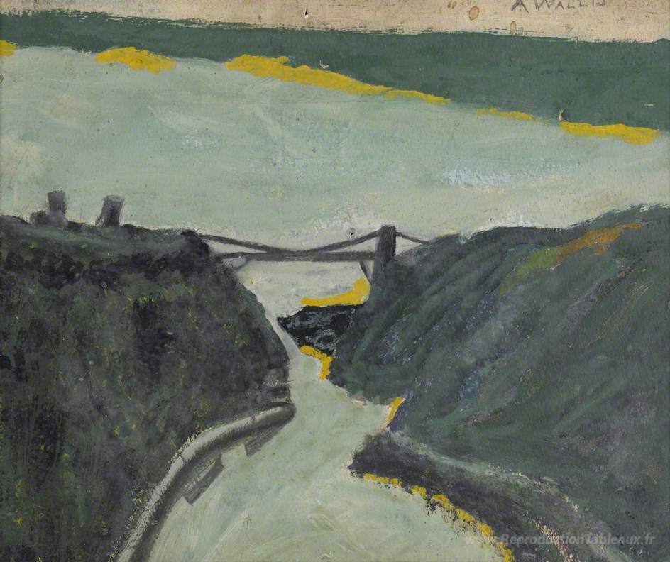 Nous vous proposons une reproduction artisanale sur toile du célèbre tableau 'Ravine avec l'estuaire. Bristol Channel and Suspension Bridge' de Alfred Wallis, provenant du Musée de la Reproduction.
