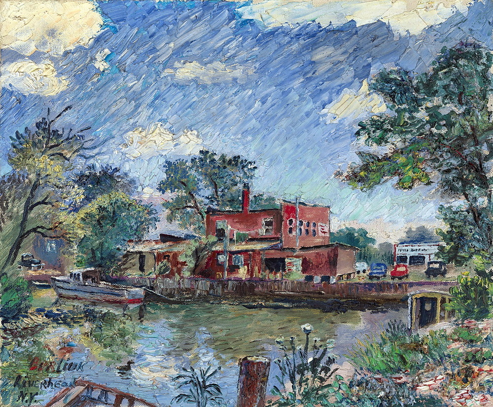 Nous vous proposons une reproduction artisanale sur toile du célèbre tableau 'Rivière' de David Burliuk, provenant du Musée de la Reproduction.
