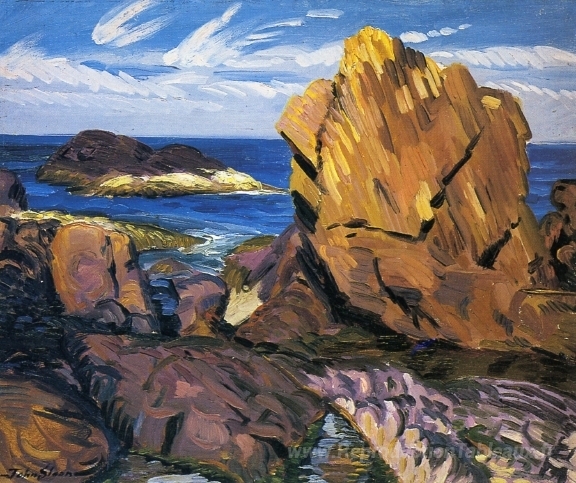 Nous vous proposons une reproduction artisanale sur toile du célèbre tableau 'Rocher jaune, Gloucester' de John French Sloan, provenant du Musée de la Reproduction.