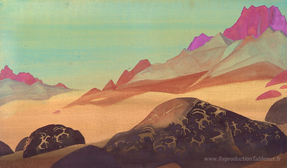 Nous vous proposons une reproduction artisanale sur toile du célèbre tableau 'Roches du Ladakh' de Nicholas Roerich, provenant du Musée de la Reproduction.