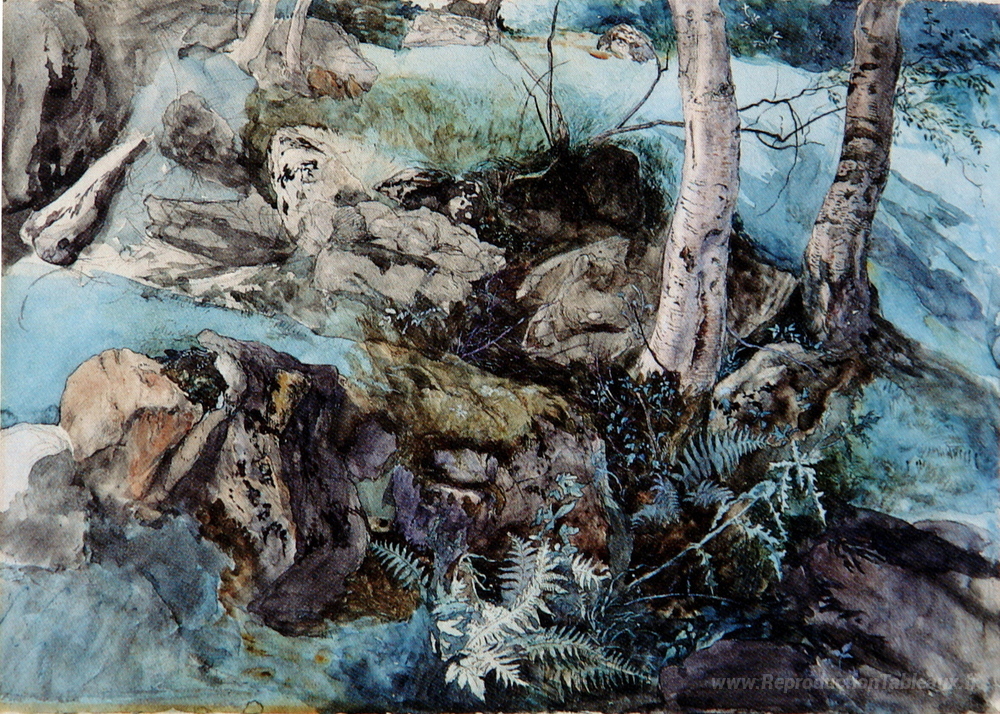 Nous vous proposons une reproduction artisanale sur toile du célèbre tableau 'Roches et fougères dans un bois à Crossmount' de John Ruskin, provenant du Musée de la Reproduction.