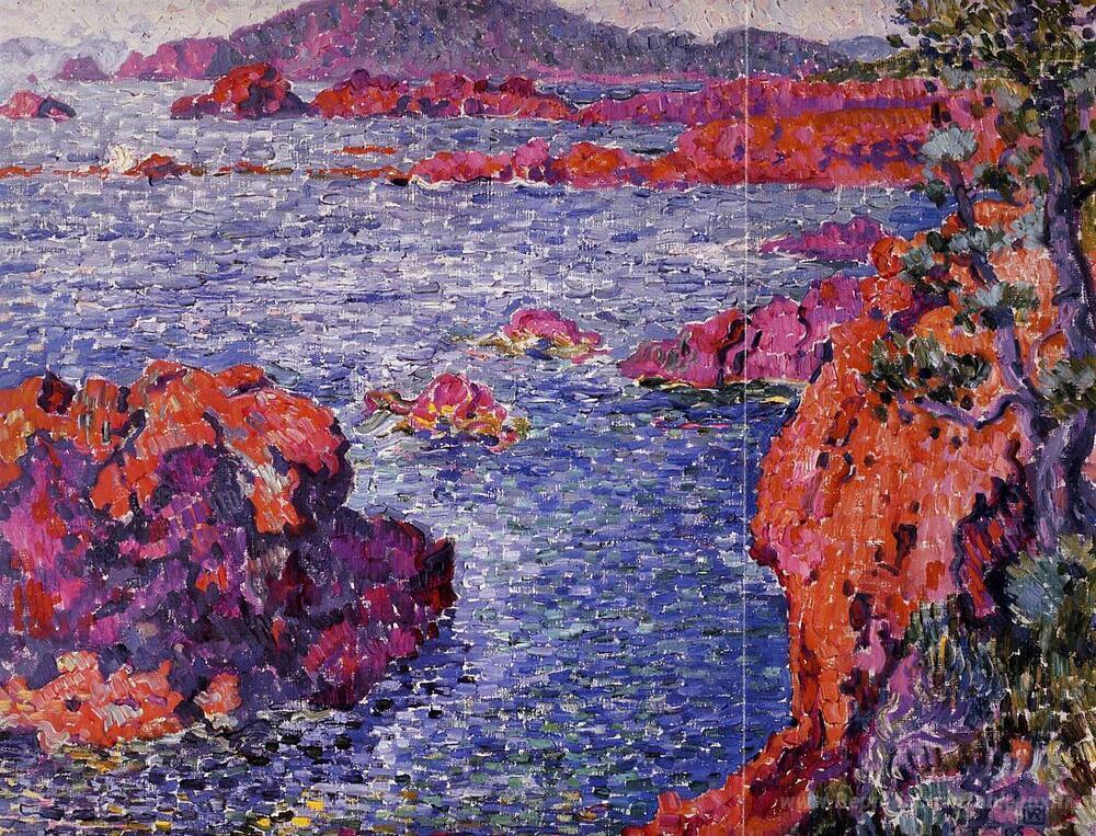 Nous vous proposons une reproduction artisanale sur toile du célèbre tableau 'Rocks à Antheor' de Theo van Rysselberghe, provenant du Musée de la Reproduction.