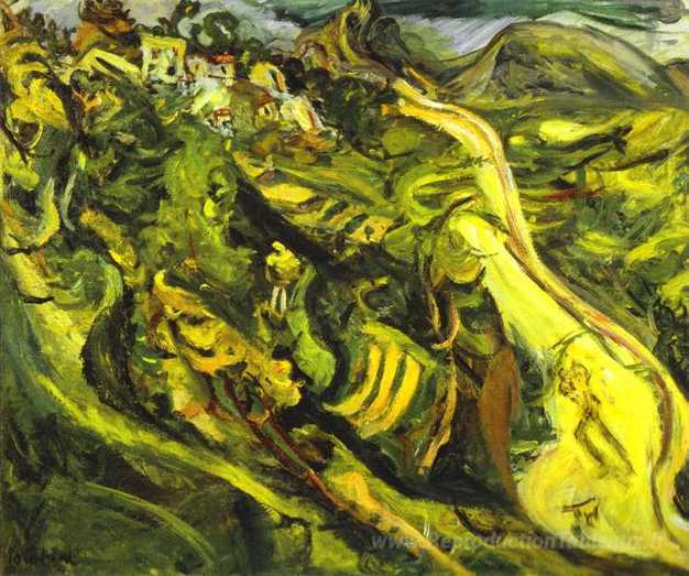 Nous vous proposons une reproduction artisanale sur toile du célèbre tableau 'Route à Cagnes' de Chaim Soutine, provenant du Musée de la Reproduction.