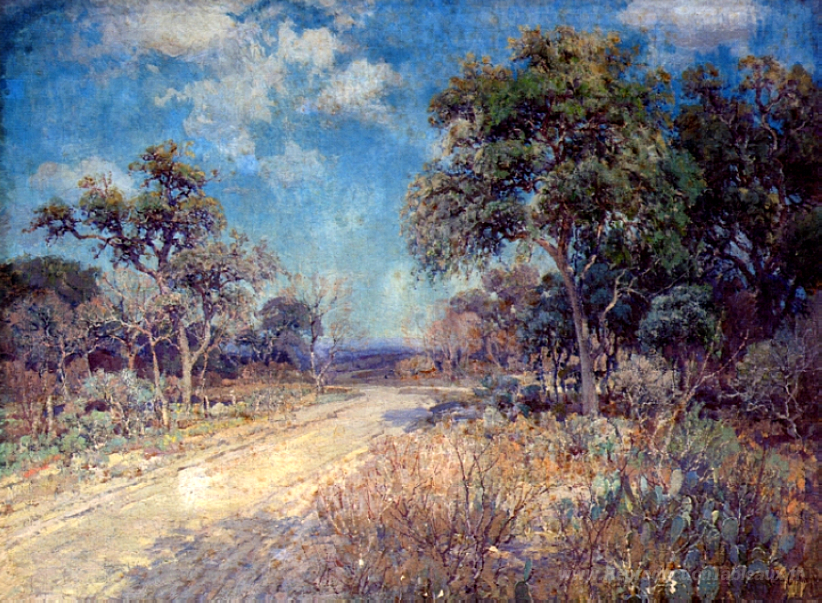 Nous vous proposons une reproduction artisanale sur toile du célèbre tableau 'Route vers les collines' de Robert Julian Onderdonk, provenant du Musée de la Reproduction.