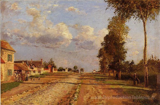 Nous vous proposons une reproduction artisanale sur toile du célèbre tableau 'Route vers Racquencourt' de Camille Pissarro, provenant du Musée de la Reproduction.