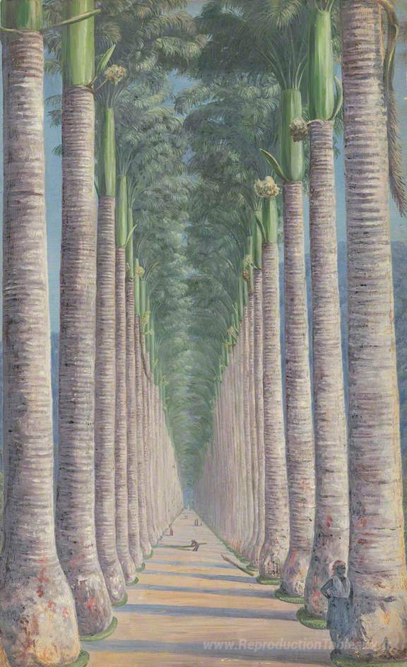 Nous vous proposons une reproduction artisanale sur toile du célèbre tableau 'Royal Palm Avenue,' de Marianne North, provenant du Musée de la Reproduction.