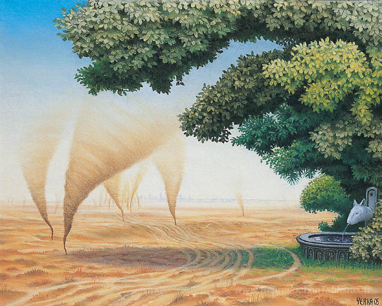 Bienvenue dans notre sélection de peintures à l'huile, où chaque reproduction est une invitation à plonger dans l'univers fascinant de l'art. Aujourd'hui, nous vous présentons l'œuvre magistrale Ruelle de la tornade de l'artiste talentueux Jacek Yerka. Cet artiste polonais, reconnu pour son style surréaliste, nous offre une vision unique de la réalité, où les couleurs vives et les détails minutieux se combinent pour créer des paysages évocateurs qui captivent l'esprit.