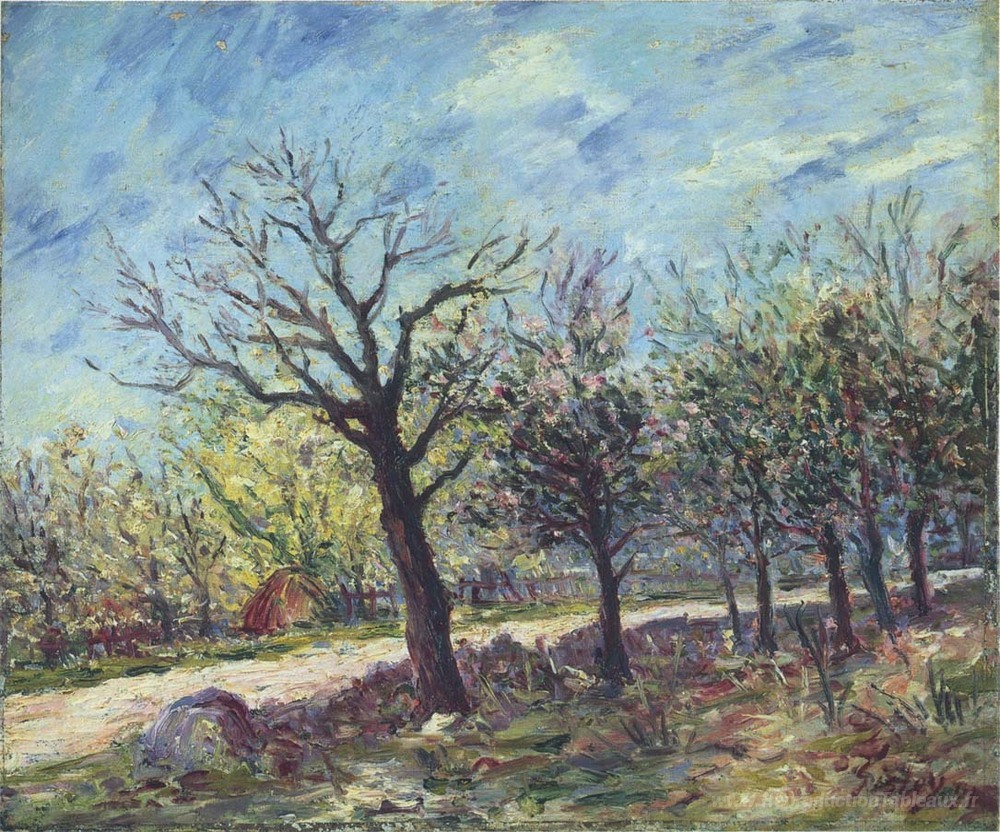 Nous vous proposons une reproduction artisanale sur toile du célèbre tableau 'Sablons au printemps' de Alfred Sisley, provenant du Musée de la Reproduction.