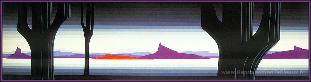 Nous vous proposons une reproduction artisanale sur toile du célèbre tableau 'Saguaro' de Eyvind Earle, provenant du Musée de la Reproduction.