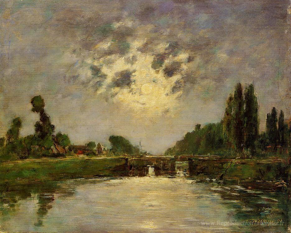 Nous vous proposons une reproduction artisanale sur toile du célèbre tableau 'Saint-Valerie-sur-Somme, le pont sur la serrure' de Eugene Boudin, provenant du Musée de la Reproduction.