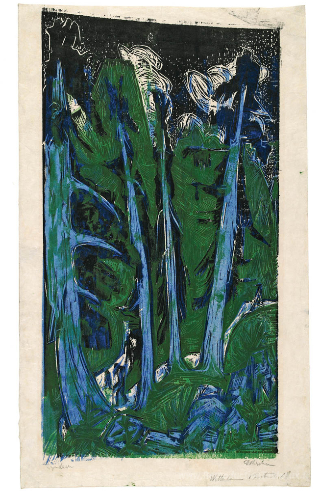 Nous vous proposons une reproduction artisanale sur toile du célèbre tableau 'Sapins balayés par le vent' de Ernst Ludwig Kirchner, provenant du Musée de la Reproduction.