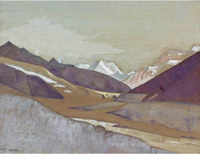 Nous vous proposons une reproduction artisanale sur toile du célèbre tableau 'Shayok, le huitième jour' de Nicholas Roerich, provenant du Musée de la Reproduction.