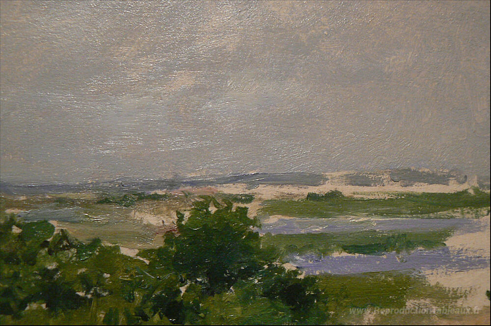 Nous vous proposons une reproduction artisanale sur toile du célèbre tableau 'Shinnecock Hills (une vue de Shinnecock)' de William Merritt Chase, provenant du Musée de la Reproduction.