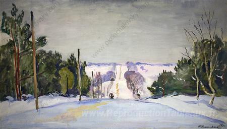 Nous vous proposons une reproduction artisanale sur toile du célèbre tableau 'Shosse en hiver' de Pyotr Konchalovsky, provenant du Musée de la Reproduction.