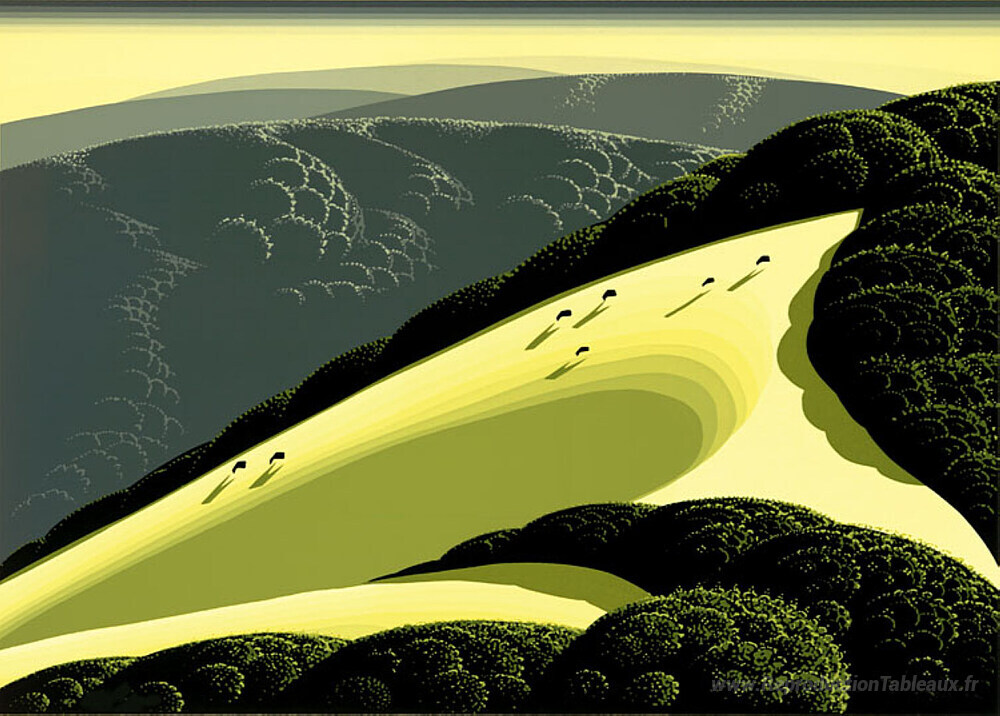 Nous vous proposons une reproduction artisanale sur toile du célèbre tableau 'Sierra Madre Foothills' de Eyvind Earle, provenant du Musée de la Reproduction.