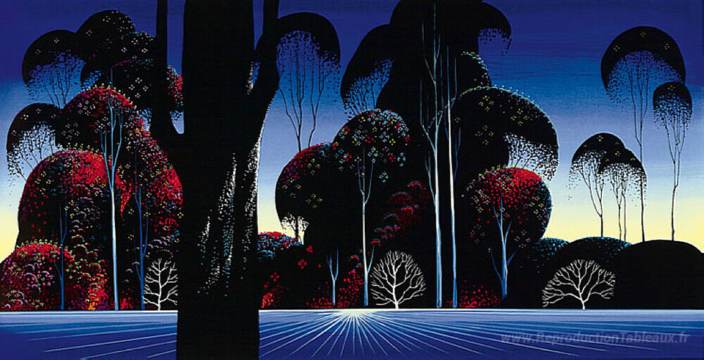Nous vous proposons une reproduction artisanale sur toile du célèbre tableau 'Silence sombre' de Eyvind Earle, provenant du Musée de la Reproduction.