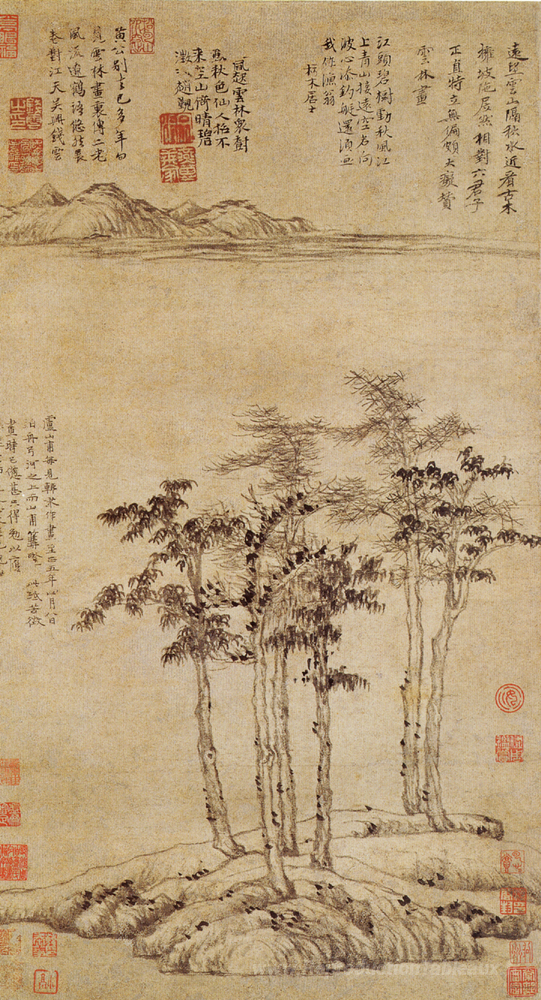 Nous vous proposons une reproduction artisanale sur toile du célèbre tableau 'Six messieurs' de Ni Zan, provenant du Musée de la Reproduction.