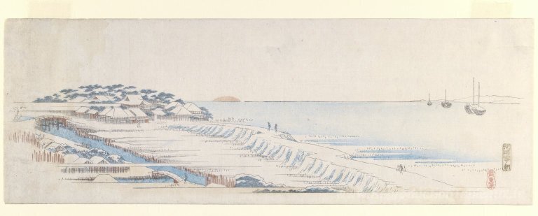 Nous vous proposons une reproduction artisanale sur toile du célèbre tableau 'Snow Dawn à Susaki' de Hiroshige, provenant du Musée de la Reproduction.