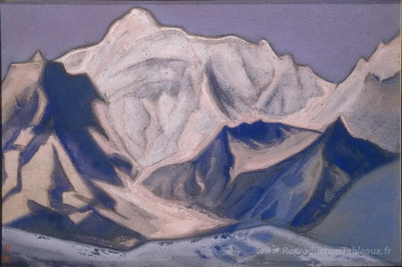 Nous vous proposons une reproduction artisanale sur toile du célèbre tableau 'Snowy Peaks au coucher du soleil' de Nicholas Roerich, provenant du Musée de la Reproduction.