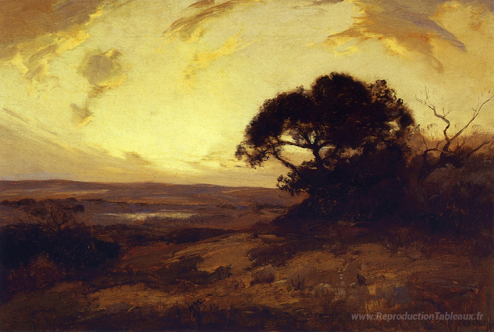 Nous vous proposons une reproduction artisanale sur toile du célèbre tableau 'Soirée d'or, sud-ouest du Texas' de Robert Julian Onderdonk, provenant du Musée de la Reproduction.