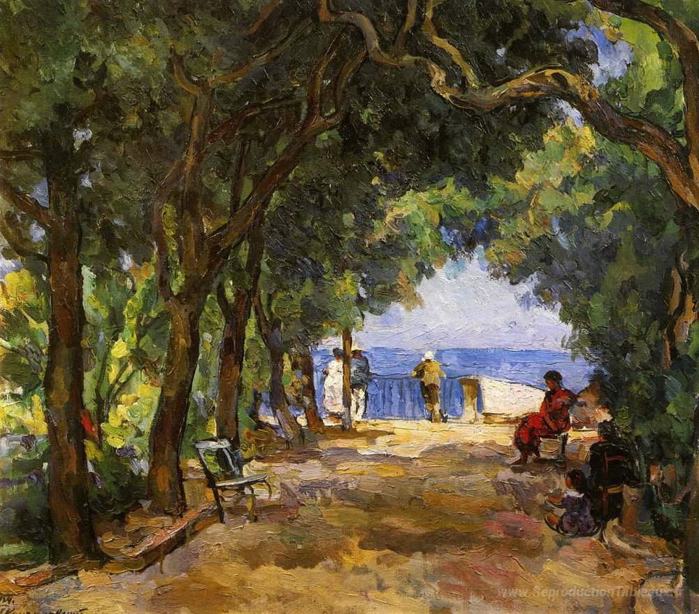 Nous vous proposons une reproduction artisanale sur toile du célèbre tableau 'Sorrento. Jardin.' de Pyotr Konchalovsky, provenant du Musée de la Reproduction.