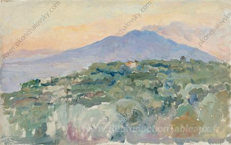 Nous vous proposons une reproduction artisanale sur toile du célèbre tableau 'Sorrento. Vésuve le soir.' de Pyotr Konchalovsky, provenant du Musée de la Reproduction.