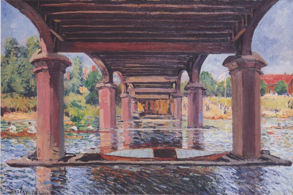 Nous vous proposons une reproduction artisanale sur toile du célèbre tableau 'Sous le pont à Hampton Court' de Alfred Sisley, provenant du Musée de la Reproduction.