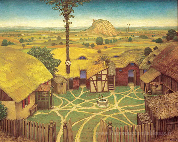 Nous vous proposons une reproduction artisanale sur toile du célèbre tableau 'Sous les paysages' de Jacek Yerka, provenant du Musée de la Reproduction.