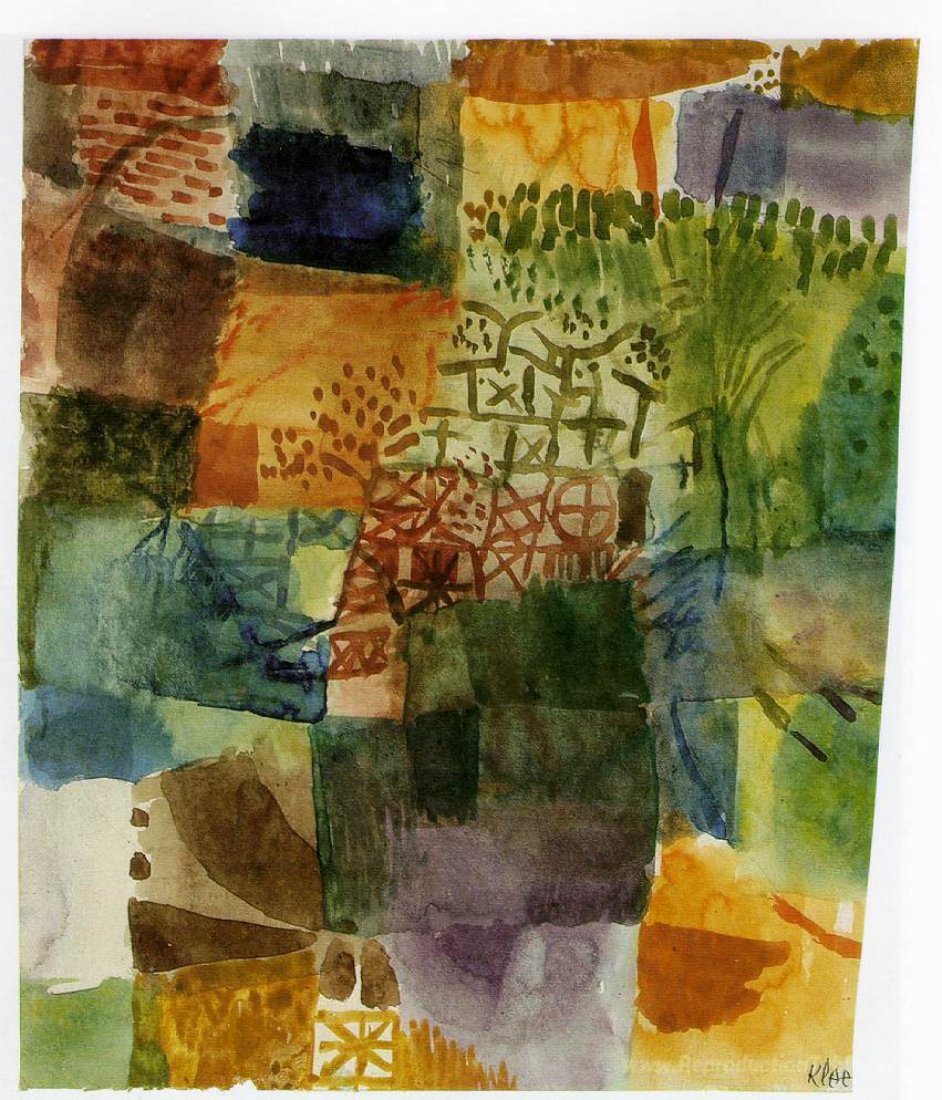 Nous vous proposons une reproduction artisanale sur toile du célèbre tableau 'Souvenir d'un jardin' de Paul Klee, provenant du Musée de la Reproduction.