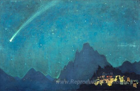 Nous vous proposons une reproduction artisanale sur toile du célèbre tableau 'Star du héros' de Nicholas Roerich, provenant du Musée de la Reproduction.