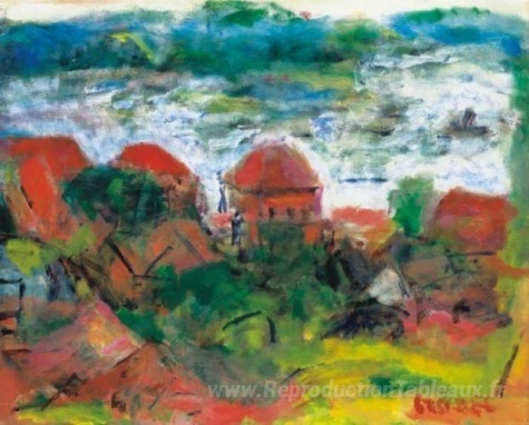 Nous vous proposons une reproduction artisanale sur toile du célèbre tableau 'Szentendre avec le Danube' de Bela Czobel, provenant du Musée de la Reproduction.