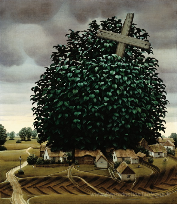 Nous vous proposons une reproduction artisanale sur toile du célèbre tableau 'Temps sous le lilas' de Jacek Yerka, provenant du Musée de la Reproduction.