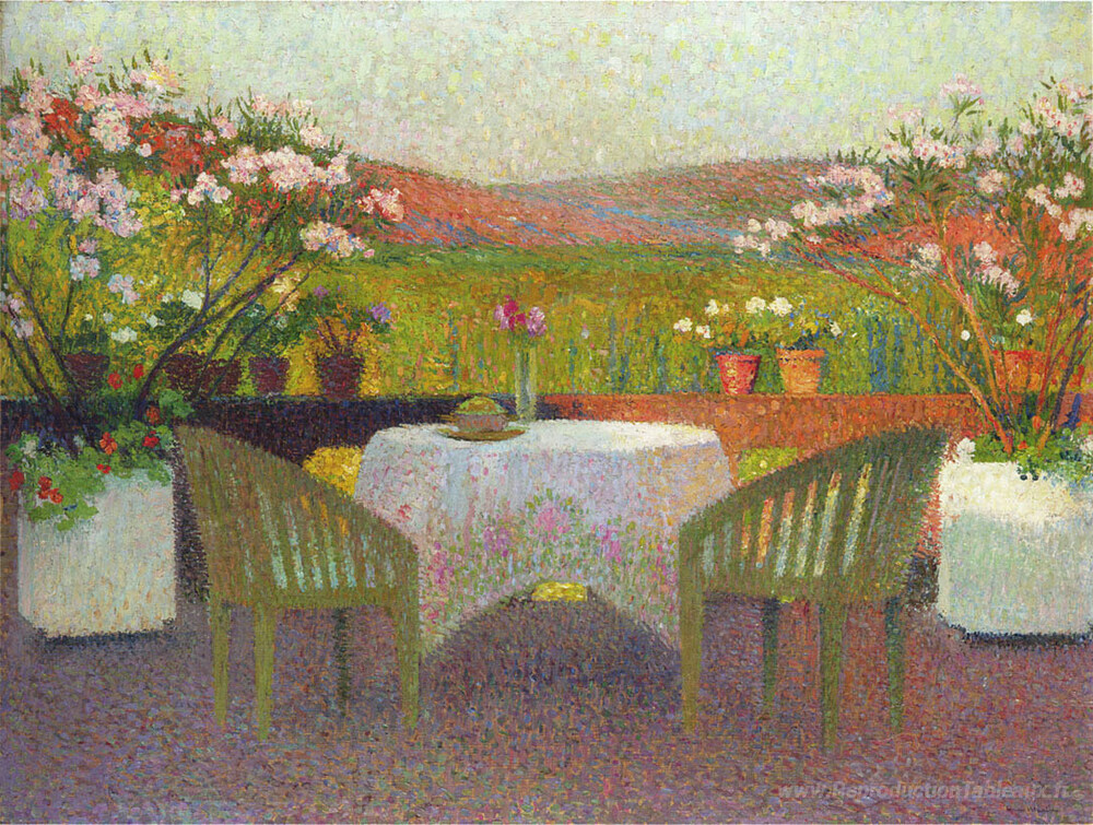 Nous vous proposons une reproduction artisanale sur toile du célèbre tableau 'Terrasse à Marquayrol' de Henri Martin, provenant du Musée de la Reproduction.