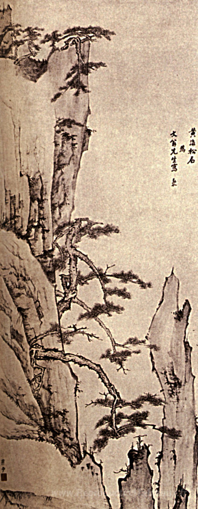 Nous vous proposons une reproduction artisanale sur toile du célèbre tableau 'Terrasse de Cinnabar' de Shitao, provenant du Musée de la Reproduction.