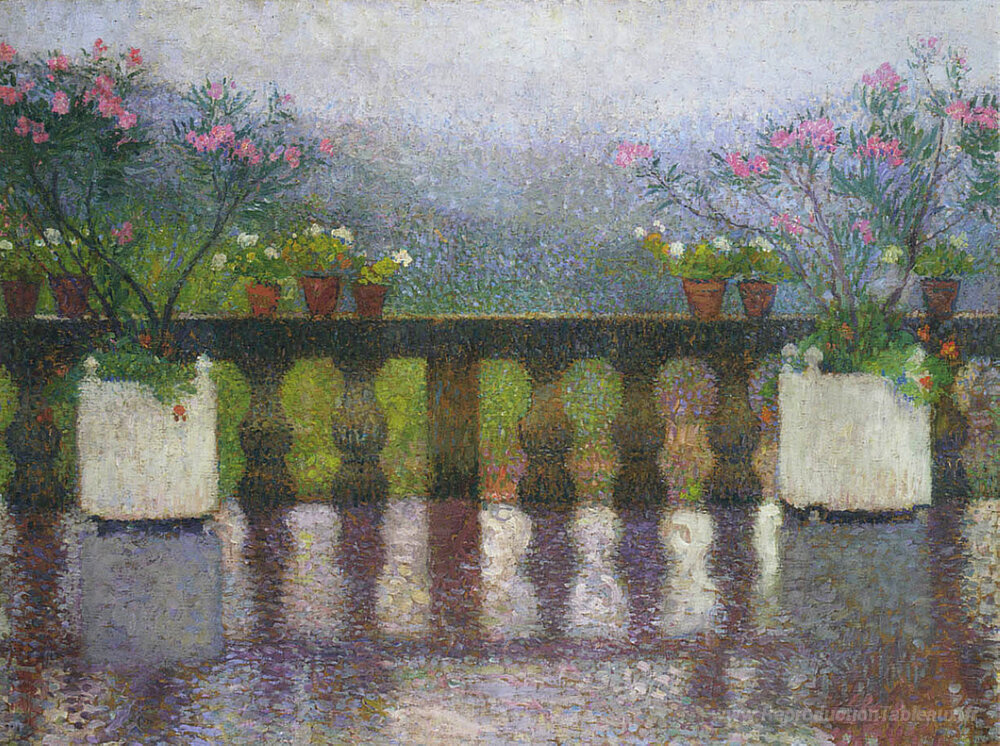 Nous vous proposons une reproduction artisanale sur toile du célèbre tableau 'Terrasse sous la pluie à Marquayrol' de Henri Martin, provenant du Musée de la Reproduction.