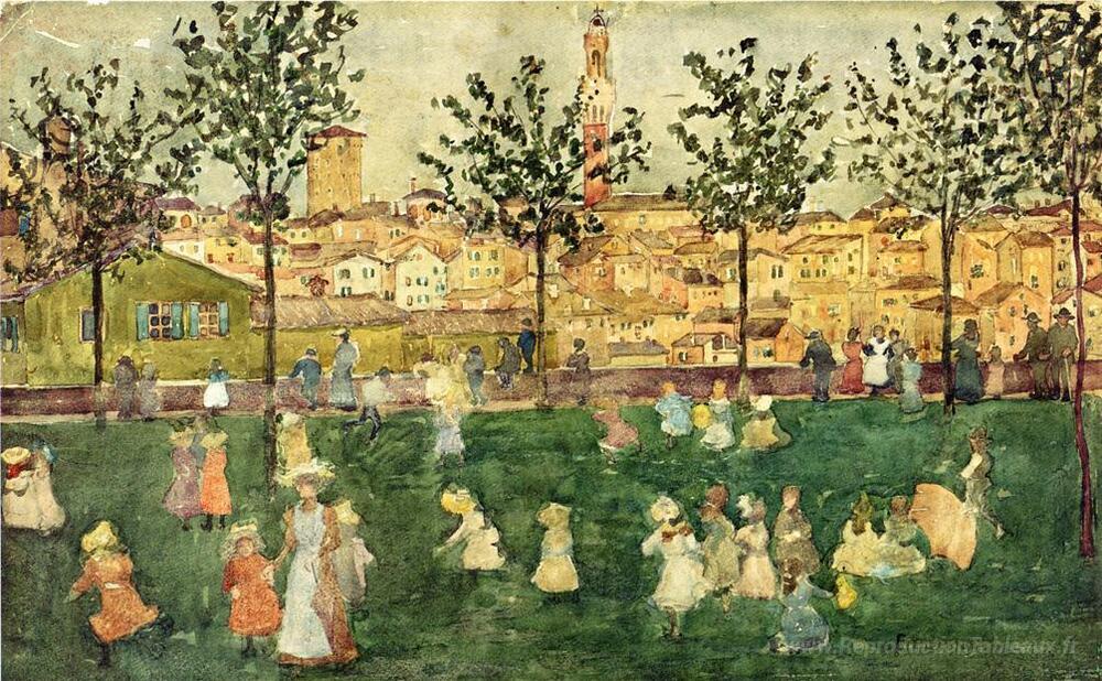 Nous vous proposons une reproduction artisanale sur toile du célèbre tableau 'Terre de sienne' de Maurice Prendergast, provenant du Musée de la Reproduction.