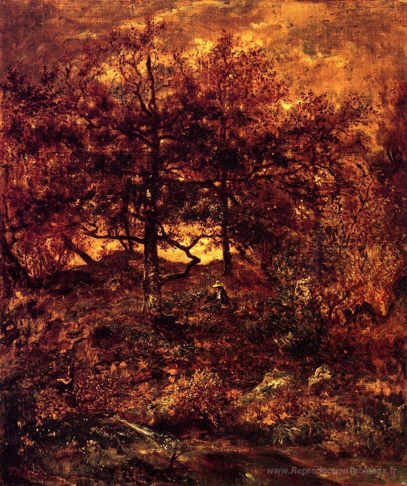 Nous vous proposons une reproduction artisanale sur toile du célèbre tableau 'Tomber au Jean-du-Paris, dans la forêt de Fontainebleau' de Theodore Rousseau, provenant du Musée de la Reproduction.