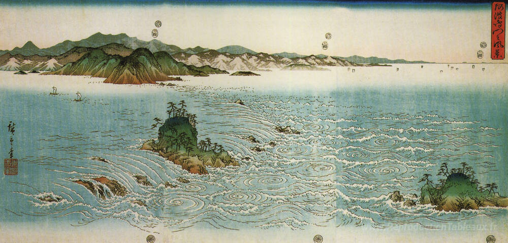 Nous vous proposons une reproduction artisanale sur toile du célèbre tableau 'Tourbillon sur une côte rocheuse' de Hiroshige, provenant du Musée de la Reproduction.