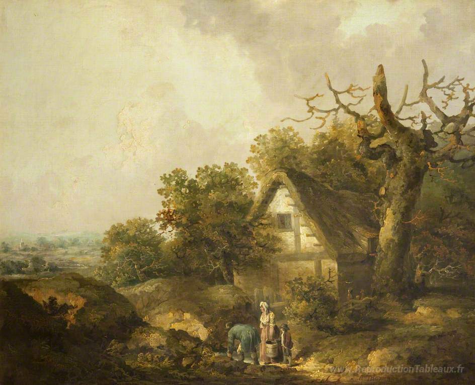 Nous vous proposons une reproduction artisanale sur toile du célèbre tableau 'Un chalet rustique' de George Morland, provenant du Musée de la Reproduction.